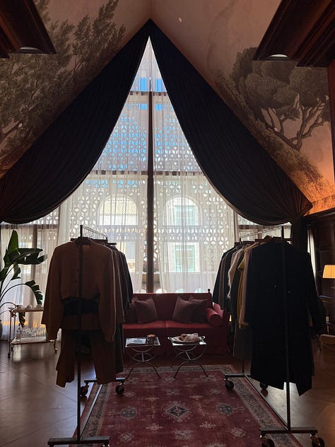 colleen allen And at Ruadh (home to my favorite (organic) sweatshirt of all time), i felt so warm and gleeful. Jac, Ruadh’s founder and CD, emits the most incredible energy— you simply want to be in her presence forever. The preview was located in a stunning suite at the twenty two (i was ofc entranced by the ginori white plates x cups alone), and the collection was a moving homage to Jac’s scottish heritage. There was a sense of lived-texture, and the kind of oversized silhouettes that are made to take you from a chic meeting at noon to tilling your rose garden at two (my dream life).