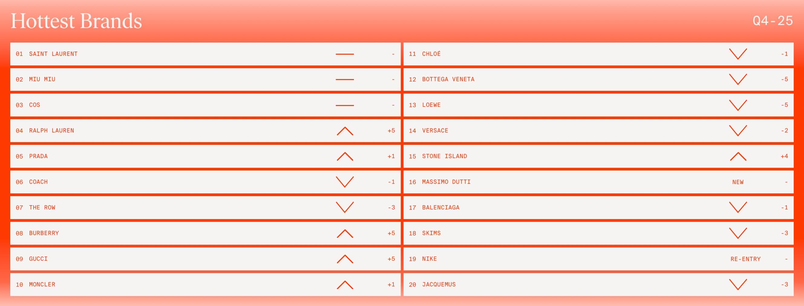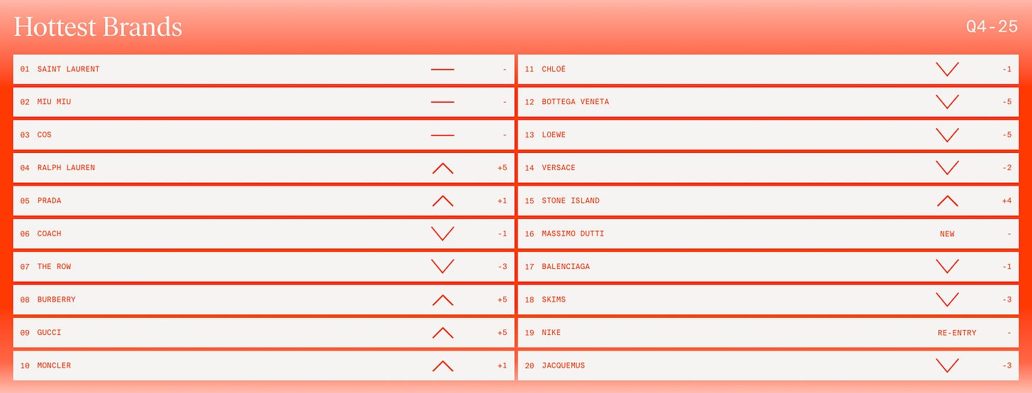 Lyst was kind enough to give me a VIP Preview, so I’ve had a week to chew on these insights. Also, just so we’re all on the same page — a lot of lyst analyses that I see are.. not analyses. They are regurgitations of either what the Lyst team gives as “important insights to know” (extracted from the dataset that’s publicly viewable) or effectively re-stating the big moves (Saint Laurent holds at #1!; Prada is back in the top 5!).